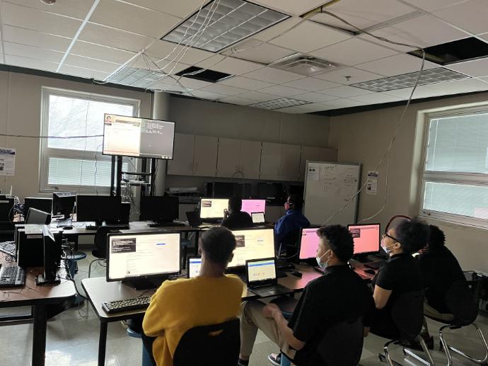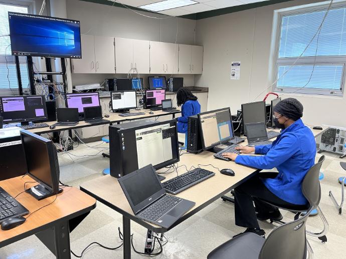 This is one of the 3 labs installed at Ponitz High school Cybersecurity class. Students were involved with the cabling. The lab you see here was designed for self learning of programming languages and web design.